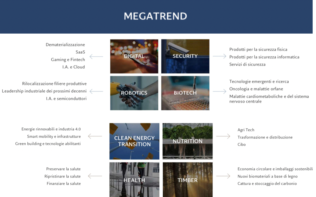 In questa strategia di investimento, il 90% delle somme è inizialmente investito in BTP, garantendo così i vantaggi dei tassi elevati attuali e fissandoli per i prossimi 3 anni. Il restante 10% viene allocato in fondi azionari specializzati nei Megatrends, i settori più promettenti dell'economia digitale.