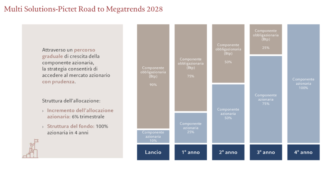 Ogni tre mesi, il 6% dei BTP si trasferisce gradualmente nei fondi azionari selezionati e gestiti da Pictet, una delle più grandi Società di Gestione specializzate e pluripremiate per i fondi tematici.
